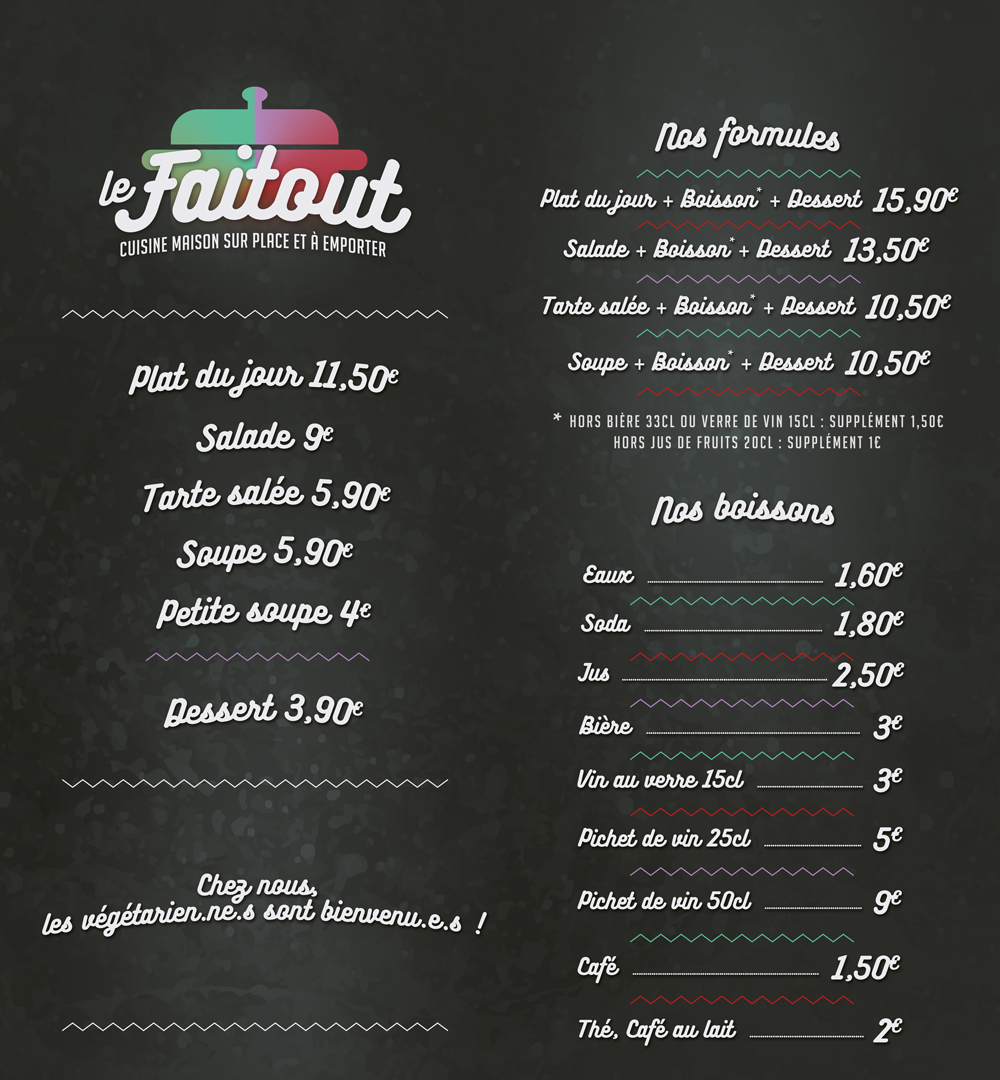 Au Faitout, nous proposons une cuisine de qualité, entièrement fait-maison, servie sur place ou à emporter en quelques minutes.  Et le tout à petit prix.